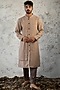 Featuring a sand color layered kurta in linen jute base with kantha detailing. It is paired with contrasting clay-colored khadi pants.