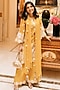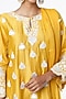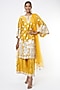 Featuring a mustard kurta in chanderi silk and chiffon base with dori and applique embroidery including a scalloped hem. It is paired with matching palazzo pants and a dupatta.