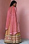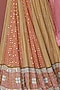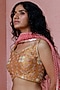 Featuring an ochre lehenga in georgette base with block print including sequins, mirror, and beaded embroidery. It is paired with a matching cotton silk blouse and an organza dupatta.