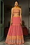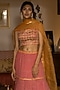 Featuring a pink tiered lehenga in georgette base with block print, sequins, beaded embellishments. It is paired with matching embroidered blouse and an organza dupatta.