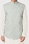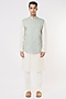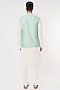 Featuring an aqua blue bundi jacket in self textured suiting base with an asymmetrical cut and thread embroidery. This contains only one piece.