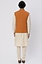 Featuring a marmalade asymmetrical bundi jacket in self textured suiting base with antique gold stitch line and brooch embroidery. This contains only one piece.