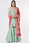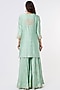 Featuring an aquamarine kurta in pure spun silk base with hand embroidery. It is paired with matching sharara pants and a contrasting banarasi dupatta having bandhani print.
