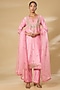 Featuring a baby pink kurta in spun silk base marori and zardosi work. It is paired with pants and a dupatta. Accentuate it with dangler earrings and heels for a festive look.