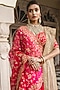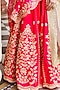 Featuring a bright red lehenga in silk base with marori, mirror, and zardosi embroidery. It is paired with a matching blouse and an organza dupatta.
