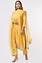 Featuring a butter yellow kurta in pure spun silk base with hand embroidery. It is paired with matching spun silk pants and a pure organza scalloped dupatta.