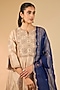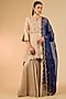 Featuring a champagne short kurta in spun silk base, adorned with zardosi work. It is paired with a sharara and a dupatta. Style the designer sharara set with statement earrings and wedges for festive gatherings or sangeet celebrations.