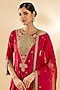Featuring a deep red anarkali in spun silk base with zardosi work. It is paired with pants and a dupatta. Accentuate it with kundan polki jewellery and embellished heels for a sangeet or wedding ceremonies.