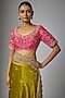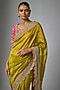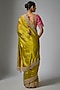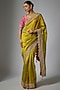 Featuring a lime green saree in kora silk base with marori and patch work. It is paired with a blouse. Accentuate it with polki jewellery and heels for a wedding, mehendi or engagement ceremony.