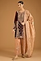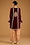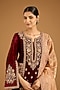 Featuring a maroon kurta in velvet base with marori embroidery. it is paired with golden tissue pants and a dupatta. Style this designer set with polki stud earrings and block heels for festive occasions, sangeet or cultual celebrations.