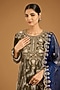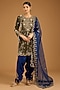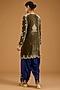 Featuring a mud green kurta in velvet base with marori and zardosi embroidery. it is paired with pure silk salwar and a dupatta. Style this designer set with polki stud earrings and block heels for festive occasions, sangeet or cultual celebrations.