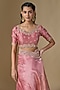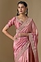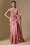 Featuring a rose gold saree in kora silk base with marori work. It is paired with a spun silk blouse. Accentuate it with statement earrings and heels for a wedding, engagement or sangeet ceremony.