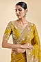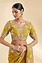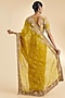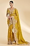 Featuring a mustard saree in organza base with pearl work. It is paired with a blouse. Accentuate the designer saree with silver jewellery and embellished heels for a wedding, haldi or engagement ceremony.