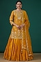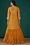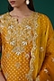 Featuring a mustard yellow bandhej kurta in pure spun silk base with hand embroidery. It is paired with a matching kora silk crush skirt and a pure organza dupatta. Accentuate it with dangler earrings and heels for a festive occasion or pooja ceremony.
