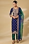 Featuring a navy blue kurta in spun silk base marori and sequins work. It is paired with emerald green pants and a dupatta. Accentuate it with dangler earrings and heels for a festive look.