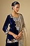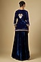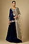 Featuring a navy blue kurta in velvet base with antique zardosi work. It is paired with a skirt and a net dupatta. Accentuate it with statement jewellery, a clutch and block heels for a wedding, sangeet or cocktail ceremony.