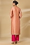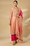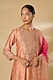 Featuring an old rose kurta in spun silk base marori and sequins work. It is paired with strawberry red pants and a dupatta. Accentuate it with dangler earrings and heels for a festive look.