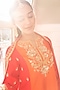 Surbhi Shah presents an orange-red kurta in pure spun silk base. It is paired with pants and an organza dupatta having marori, mukaish and cutdana work. Accentuate with dangler earrings and heels for festive occasions.