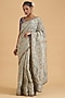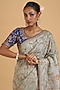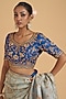 Featuring a powder blue saree in tissue base with marori work. It is paired with a teal blue pure spun silk blouse having hand embroidery. Style it with dangler earrings and heels for a wedding or engagement ceremony.