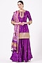 Featuring a purple kurta in pure silk base with hand embroidery. It is paired with matching sharara pants in pure spun silk base and a pure organza bandhani dupatta.
