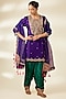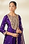 Featuring a purple kurta in spun silk base with marori and zardosi work. It is paired with pure silk salwar pants and a dupatta. Accentuate it with polki jewellery, a clutch and embellished heels for a wedding or sangeet ceremony.