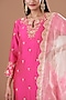 Featuring a rani pink kurta in pure spun silk base with hand embroidery. It is paired with a matching pants and a pure organza shaded scalloped dupatta.