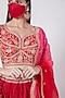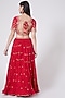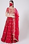 Featuring a red blouse in chanderi base with hand embroidery. It is paired with a matching lehenga and an organza scalloped dupatta.