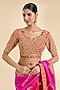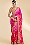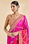 Featuring a red and rani saree in kora silk base with marori work. It is paired with a blouse. Accentuate the designer saree with polki jewellery and embellished heels for a wedding, sangeet or engagement ceremony.