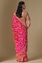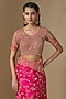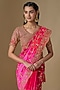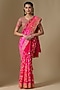 Featuring a red-rani saree in kora silk base with zardosi and mirror work. It is paired with a spun silk blouse. Accentuate it with statement earrings and heels for a wedding, engagement or sangeet ceremony.