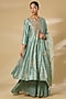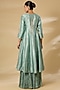 Featuring a sea blue anarkali in spun silk and kora silk base with zardosi work. It is paired with sharara pants and a dupatta. Accentuate with statement jewellery and heels for a festive ceremony.