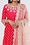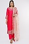Featuring a strawberry pink kurta in pure spun silk base with hand embroidery. It is paired with matching spun silk pants and a pure organza dupatta.
