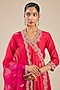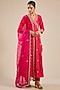 Featuring a strawberry red angrakha in spun silk base with marori and resham work. It is paired with pants and a dupatta. Accentuate it with traditional jhumkas, a vibrant potli bag, and embellished juttis for a stylish ensemble, ideal for pooja ceremonies, festive gatherings or joyful family celebrations.