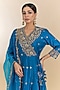 Featuring a teal blue angrakha kurta in spun silk base with marori work. It is paired with pants and a dupatta. Accentuate with statement jewellery and heels for a festive ceremony.