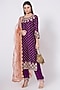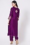 Featuring a purple kurta in pure spun silk base with mix hand embroidery. It is paired with matching pants and a pure organza peach scalloped dupatta.