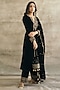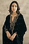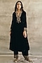 This black kurta and salwar set is embroidered intricately by hand with aari threadwork as the base and further highlighted with zari, bead and sitara work. The plunging Mughal neckline juxtaposes a beautiful silk velvet embroidered and delicately scalloped dupatta. Style this kurta set with golden jewellery and a pair of heels for festive or wedding ceremonies.