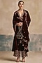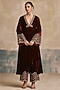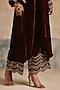 Featuring a burgundy asymmetrical kurta in silk velvet base with antique gold embroidery. It is paired with palazzo pants and a dupatta. Style it with chandbali earrings, juttis and a potli bag for festive nights or wedding functions.