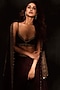 Featuring a coca cola kimono jacket in habutai silk base with antique gold zardosi embroidery. Paired with meticulously tailored pants and a matching blouse, this ensemble is a versatile must-have.
