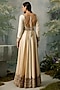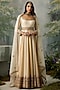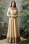 Featuring an ivory and dark beige anarkali in silk chanderi base with gold aari and zardosi embroidery. It is paired with pants and an organza dupatta. Accentuate it with embellished juttis and delicate jewellery for a graceful yet contemporary look, perfect for festive celebrations, family functions or cultural events.
