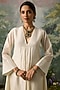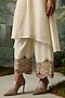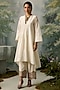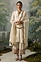 Featuring an ivory asymmetrical kurta in silk chanderi base with bell sleeves, aari, zardosi, thread, sitara, beads and cutdana embellishments. It is paired with scalloped palazzo pants and an organza dupatta. Accentuate it with embellished juttis and delicate jewellery for a graceful yet contemporary look, perfect for festive celebrations, family functions or cultural events.
