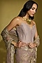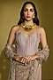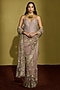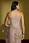 Featuring a lilac saree in net base with kiran dori, gota and floral motifs embroidery. It is paired with a silk tissue corset blouse. Style it with heavy jewellery, a sleek clutch, and strappy heels for a cocktail, sangeet or reception look.