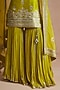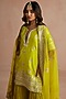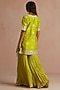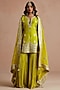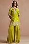 Featuring a mehendi green kurta in raw silk base with gota stripes and leather work. It is paired with matching georgette gharara pants and an embroidered organza dupatta.