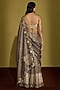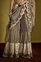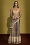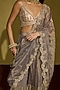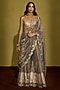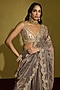 Featuring a peach and wine draped sharara saree in tissue silk base with patchwork. It is paired with a strappy blouse. Style it with heavy jewellery, a sleek clutch, and strappy heels for a cocktail, sangeet or reception look.
