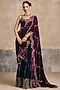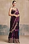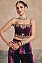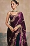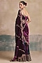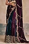 Featuring a plum and peacock blue sharara saree in silk velvet base with embroidery. It is paired with an embroidered corset-style blouse. Style it with a bold lip and a potli bag for festive nights, sangeet or wedding functions.