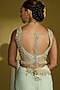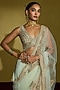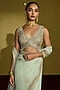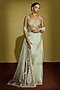 Featuring a sage green saree in net base with motifs hand embroidery. It is paired with a silk tissue blouse. Style it with heavy jewellery, a sleek clutch, and strappy heels for a cocktail, sangeet or reception look.