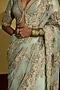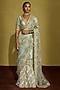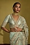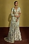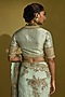 Featuring a sage green pre-draped saree in net and zari tissue base with fishtail hem. It is paired with a brocade silk blouse. Style it with heavy jewellery, a sleek clutch, and strappy heels for a cocktail, sangeet or reception look.