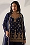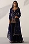 Featuring a sapphire blue short kurta in silk chanderi base with aari, zardosi, cutdana and antique threadwork embellishments. It is paired with gharara pants and an organza dupatta.