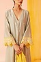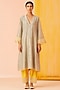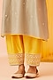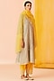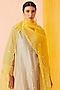 Featuring a sea green kurta in silk chanderi base with mirror motif, pearls, sequins and beaded hand embroidery. It is paired with contrasting yellow salwar pants and an organza dupatta.