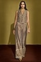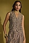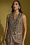 Featuring a wine gold waistcoat in tissue silk base with kiran dori and gota embroidery. It is paired with wide-leg pants. Accentuate it with statement gold earrings and sleek metallic heels for a polished look, ideal for festive soirees, wedding festivities or cocktail celebrations.