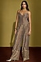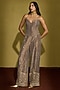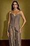Featuring a wine gold sculpted corset in tissue silk base with kiran dori, beads and cutdana hand embroidery. It is paired with wide-leg pants. Accentuate it with statement gold earrings and sleek metallic heels for a polished look, ideal for festive soirees, wedding festivities or cocktail celebrations.