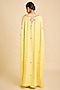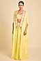 Featuring a yellow cape in silk base. It is paired with a mirror embellished draped skirt and a sleeveless blouse. Style this set with chunky statement earrings, heels and a sleek clutch, perfect for a haldi ceremony.